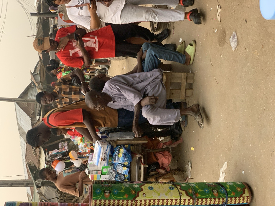 A bustling outdoor market scene shows people gathered around a vendor's stall. The stall displays various goods, including packaged items and a patterned rug. An elderly man is sitting on wooden pallets, seemingly observing the activity. Other individuals are examining the merchandise. The backdrop includes corrugated iron roofing typical of informal market areas. Overhead power lines add to the crowded environment. The general atmosphere suggests a busy day of commerce.