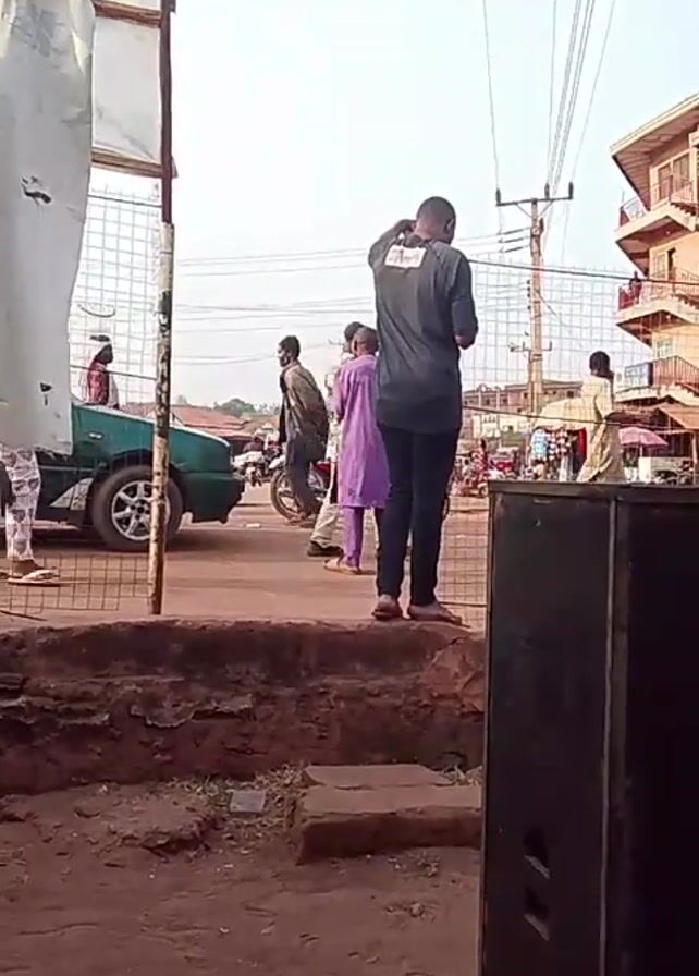 street scene with people walking and a parked car. A person in a gray shirt stands on a raised platform, possibly taking pictures or recording a video. Other people walk past, some carrying children. There is a building in the background and power lines overhead. A speaker is visible in the foreground. The ground is reddish-brown dirt.