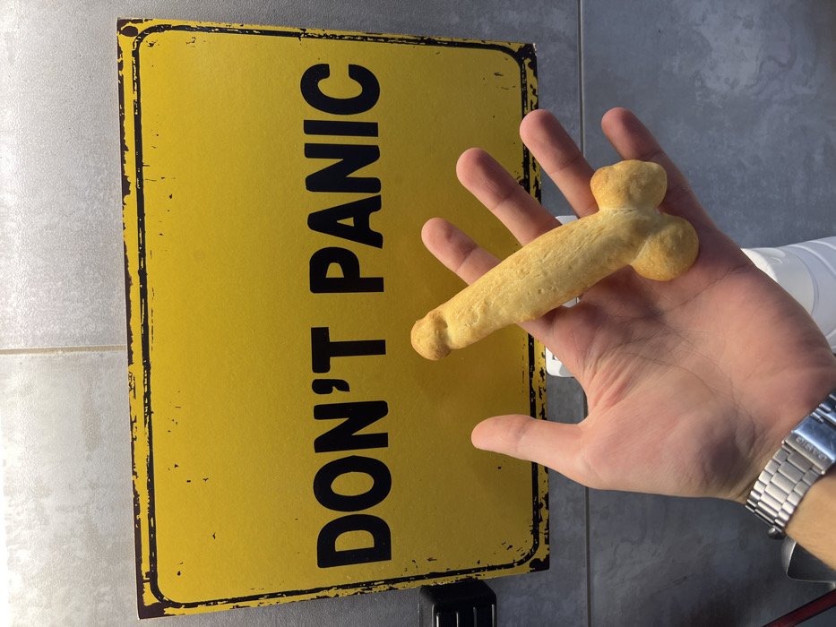 - "The image captures a close-up, eye-level view of a light-skinned hand holding a phallic-shaped baked good against a sign on a tiled wall in an indoor setting in Budva, Montenegro" by FM-T5Wdg1, licensed under CC BY 4.0