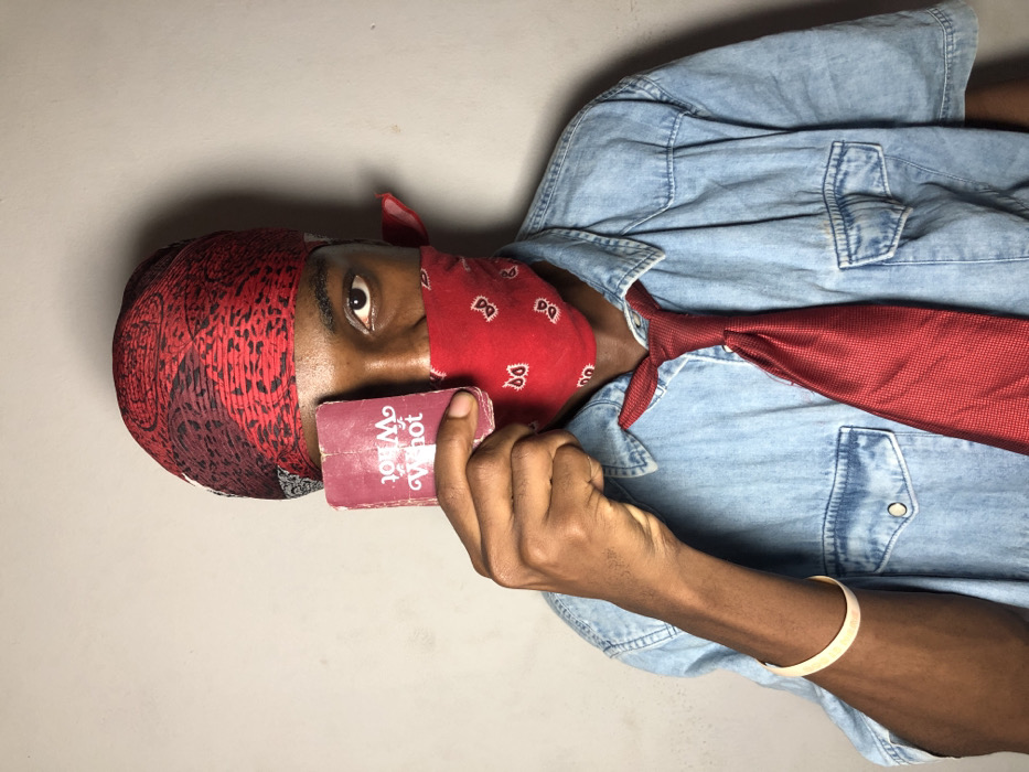 A dark-skinned individual, appearing male, is centered in a chest-up portrait against a plain light grey wall in Ngleshi Amanfro, Ghana. The subject wears a red and black patterned head covering and a red bandana with white paisley patterns obscuring the lower face. The visible right eye directly engages the camera. The subject's left hand holds a worn, reddish-pink rectangular object, partially covering the left eye. The object displays the word "Whot" in white, inverted relative to the viewer. Clothing consists of a light blue denim-style shirt with metal snap buttons and two chest pockets, and a red textured tie. A light-colored wristband is present on the subject's left wrist.