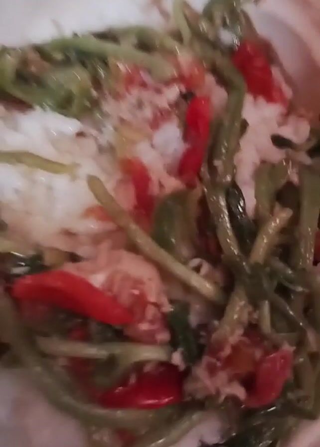 plate of food that appears to be a serving of white rice topped with what looks like sautéed green beans and slices of red pepper. The dish is presented in a white plate with scalloped edges. The video is initially out of focus and then stabilizes. There are subtle movements in the video suggesting it is being held or filmed by hand.