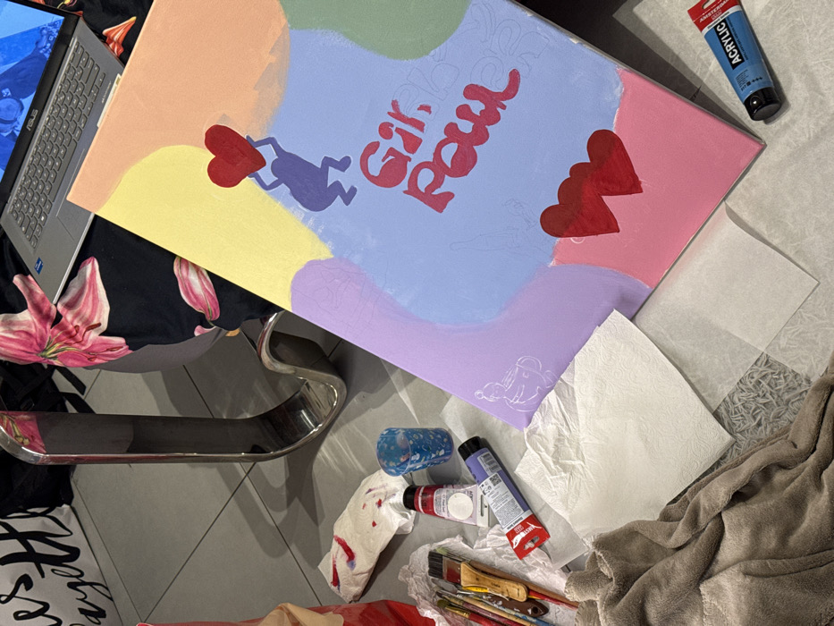 A painting in progress sits atop a table with a laptop. The canvas is divided into pastel color blocks, including peach, yellow, blue, lilac, and pink. "Girl Power" is painted in red cursive. Two hearts, one held by a figure, and another set of two, are painted in red. Art supplies are scattered around the canvas: paint tubes, brushes, paper towels, and a cup. A portion of the floor is visible, with a chair and blanket adding to the creative workspace's chaotic atmosphere.