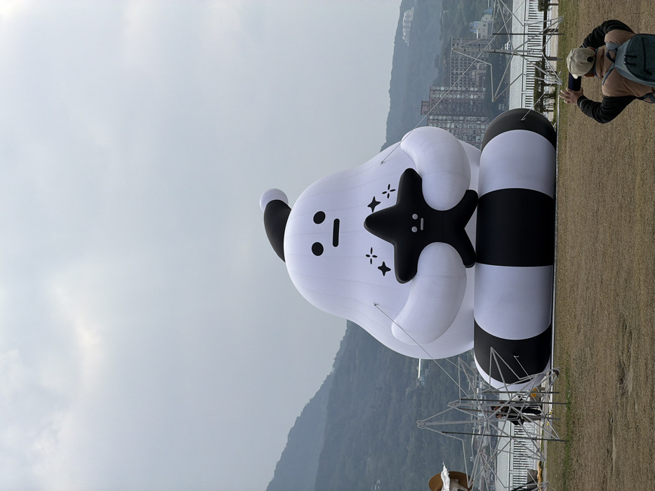 A large, white inflatable character stands on a grassy field near a lake and mountains. The character has black and white striped legs, a black star-shaped patch with a small face on its chest, and a simple facial expression on its head. A person wearing a tan hat and backpack takes a photo of the character with their phone. Metal scaffolding is visible behind the character, and buildings are seen in the distance across the lake. The sky is overcast.