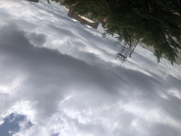 The image displays an urban landscape in Abuja, Nigeria, under heavily overcast conditions. The sky occupies approximately two-thirds of the frame, dominated by dense, dark grey stratocumulus clouds, with some lighter cloud formations and a small patch of blue sky visible in the upper right quadrant. In the lower left, a dense canopy of dark green foliage from multiple trees partially obscures the lower portions of structures behind them. A metallic lattice telecommunications tower, equipped with multiple antennae or panel-like instruments, stands prominently behind the trees, slightly left of the image's vertical center. A light-colored building is partially visible behind the foliage to the left of the tower. In the mid-ground and background, several multi-story buildings with light-toned, possibly beige or light brown, facades are visible. These structures are consistent with modern residential or commercial architecture found in developed areas of Abuja. No individuals, vehicles, or specific human activities are depicted. The scene represents a typical urban setting in a district such as Wuse, Garki, or Utako, characterized by a mix of infrastructure and multi-story edifices beneath a heavily clouded sky.