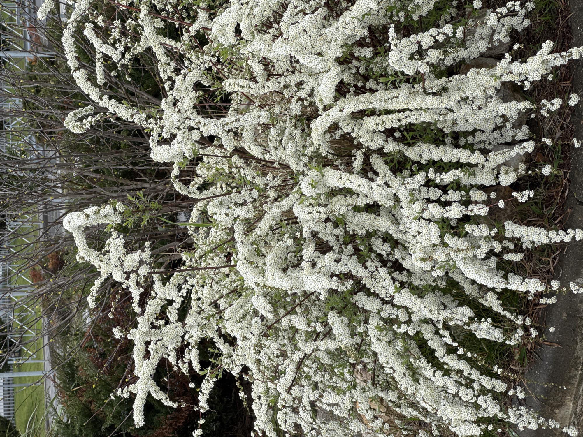 flowering shrub with small white flowers. The shrub has multiple branches with dense clusters of flowers. Some green leaves are visible among the flowers. In the background, there are other trees and a fence. A concrete sidewalk borders the shrub. The location is the city of Sirius, Russia.