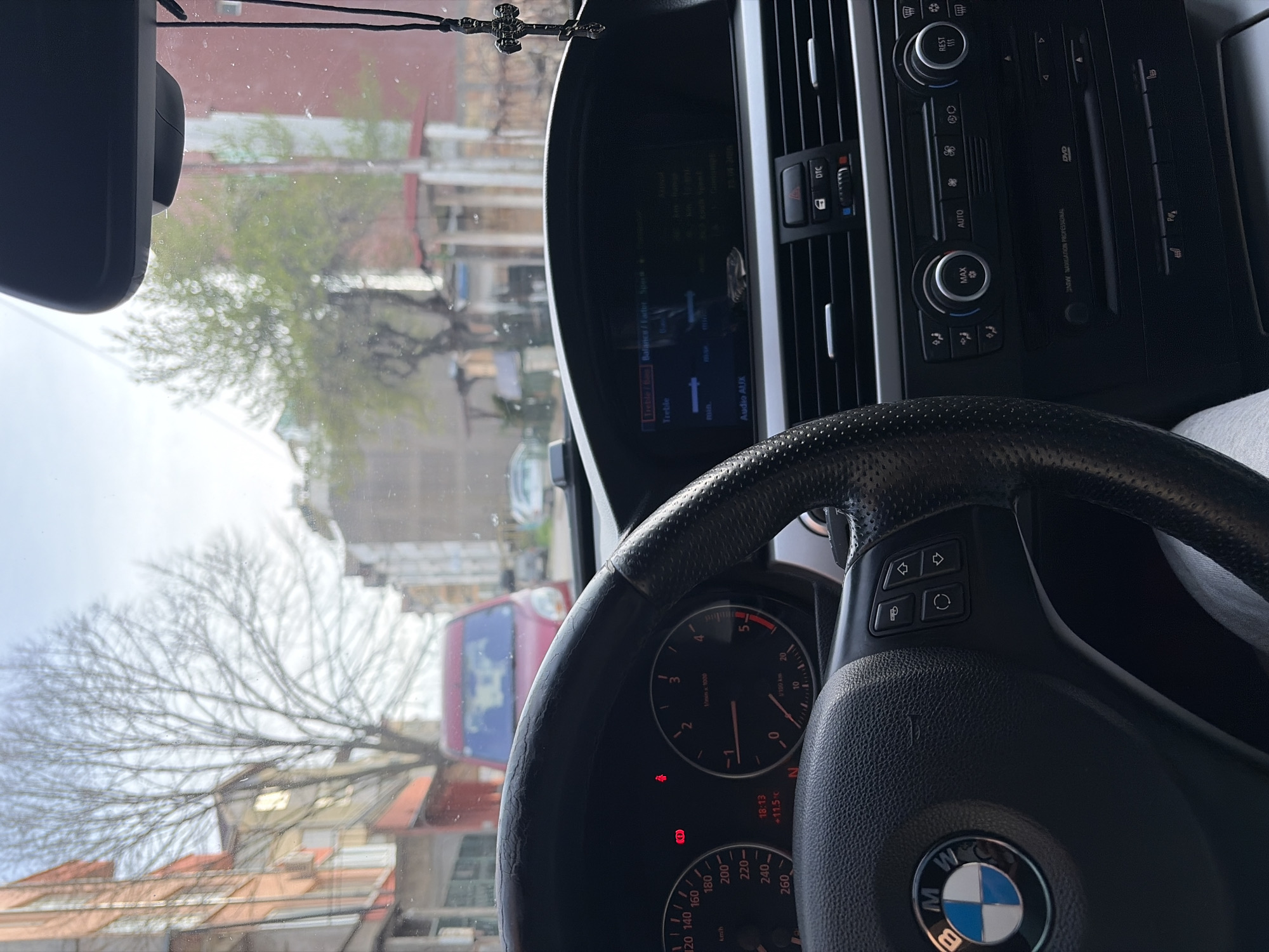 interior of a BMW car, specifically the steering wheel, dashboard, and infotainment system