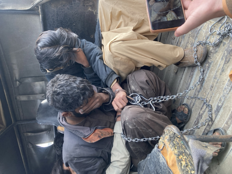 The scene is located within Quetta City Tehsil, Pakistan, specifically inside the cargo area of a utilitarian vehicle. At least three adult males are visible. In the foreground-center, two men are seated on the metal floor, hunched over with their faces obscured by their hands. The man on the left has dark, curly hair and a beard, wearing a dark gray jacket with an orange collar lining and brown trousers. His wrists are secured by metal cuffs. Heavy, large-link metal chains, some with twisted elements, are secured around his lower legs/ankles and rest on the floor. The man on the right has dark, wavy hair, dressed in a dark jacket and light brown trousers, also with a hand covering his face/head. His right wrist is visibly cuffed. Similar heavy metal chains secure his lower legs/ankles, visibly connecting to the man on the left. A third individual's leg, wearing a dark sandal, is partially visible in the lower left foreground. Indistinct figures are present in the vehicle's background. In the lower right, a hand holds a smartphone, its screen reflecting the chained legs.