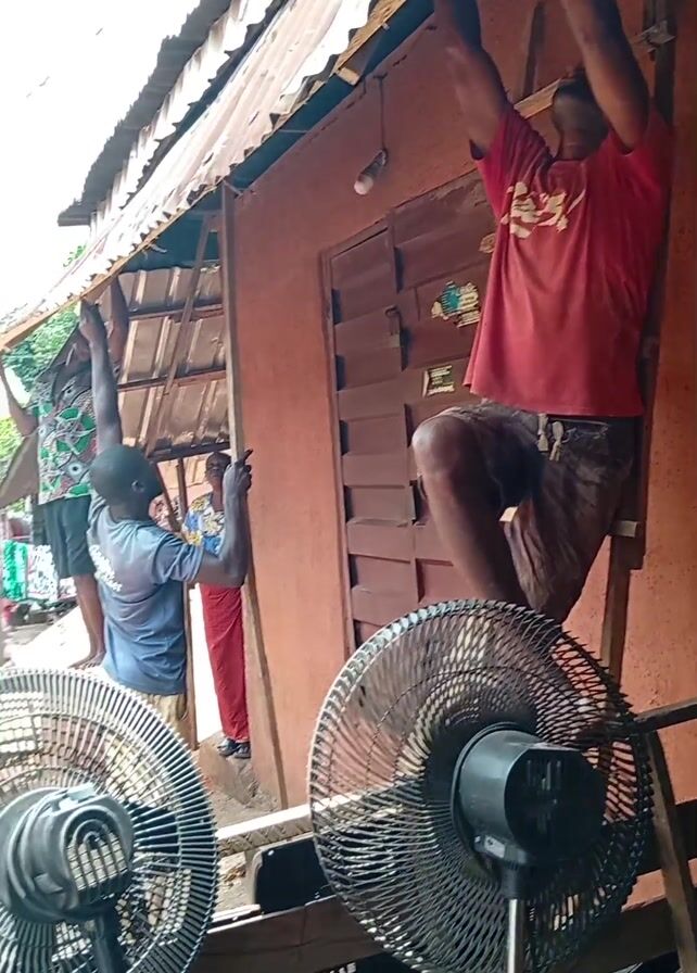 The video captures a scene where three men are working on the roof of a small, orange-colored building. One man in a red shirt is standing on a wooden ladder, reaching up to adjust or install something along the edge of the roof. Another man, wearing a blue shirt, is also working on the roof, positioning a piece of wood. A third man, in a multi-colored shirt, also appears to be assisting in the roofing work. The building has a brown door and a corrugated metal roof. In the foreground, there are two large, black stand fans. Behind the building is a street scene with some other buildings and people visible in the distance.