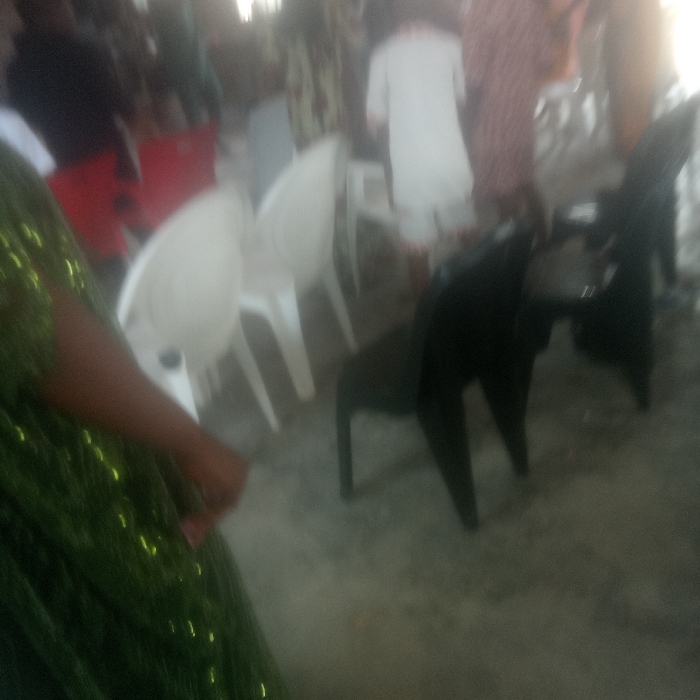 A blurry indoor scene shows a gathering of people and plastic chairs. The chairs are arranged in rows, with both white and black chairs visible. Some people are standing and others are seated. The overall lighting is dim. A portion of a person wearing a green garment with shimmering details is present in the lower left corner. The quality of the image suggests it was taken with a low-resolution camera or under poor lighting conditions.