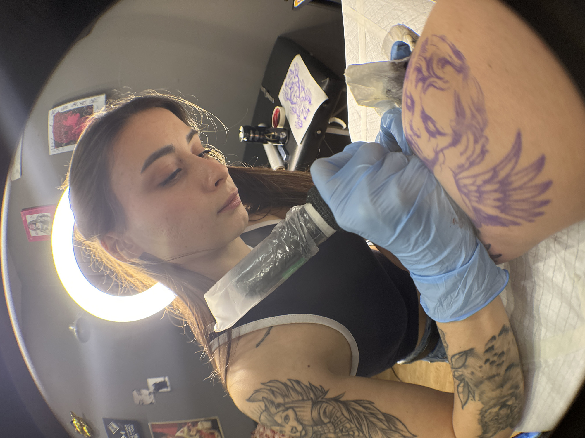 A fair-skinned woman in a black and white tank top is tattooing a fair-skinned person's arm, which is covered in a purple angel design. The woman wears blue gloves and holds a tattoo machine in a plastic sleeve. A ring light illuminates her face. She has brown hair and light eyes. The arm being tattooed has another tattoo visible on the lower portion. Behind the woman is a tattoo station with various supplies and artwork on the wall. The location cannot be determined from this image.