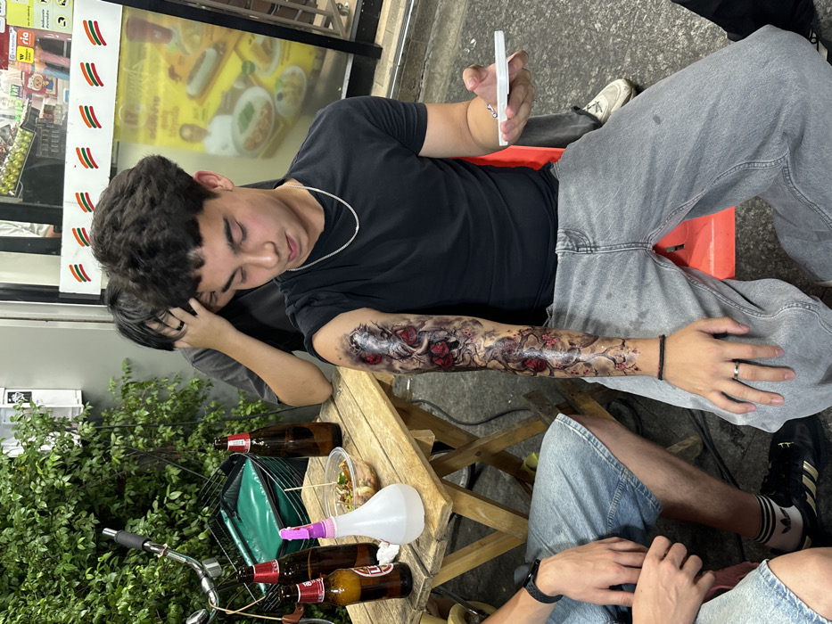 The image captures three individuals in an outdoor urban environment in Bangkok, Thailand, identified by a prominent 7-Eleven store logo and Thai script visible on signage in the background. The central figure is a young male with dark, curly hair, wearing a black t-shirt, a silver chain necklace, and light gray wide-leg jeans, seated on a red plastic stool. His right arm is fully covered from the shoulder to the wrist with a detailed temporary sleeve tattoo or body paint depicting exposed bone, sinew-like structures, and multiple red roses. He holds a white rectangular object in his left hand, looking down at his arm. To his left, a second person is partially visible, seated on a grey stool behind the central figure. Further left, a third person is seen from the waist down, wearing denim shorts and black sneakers, with their right forearm resting on a rustic wooden table. On this table are three brown glass beer bottles, one with a "LEO" label visible, a white plastic spray bottle with a pink nozzle, and a clear plastic container holding food with chopsticks. A bicycle with a green basket is partially visible on the far left behind the table. Dense green foliage covers the left background, while the illuminated 7-Eleven storefront occupies the right background. The ground is paved concrete. The scene suggests a casual gathering in an evening or nighttime street setting.