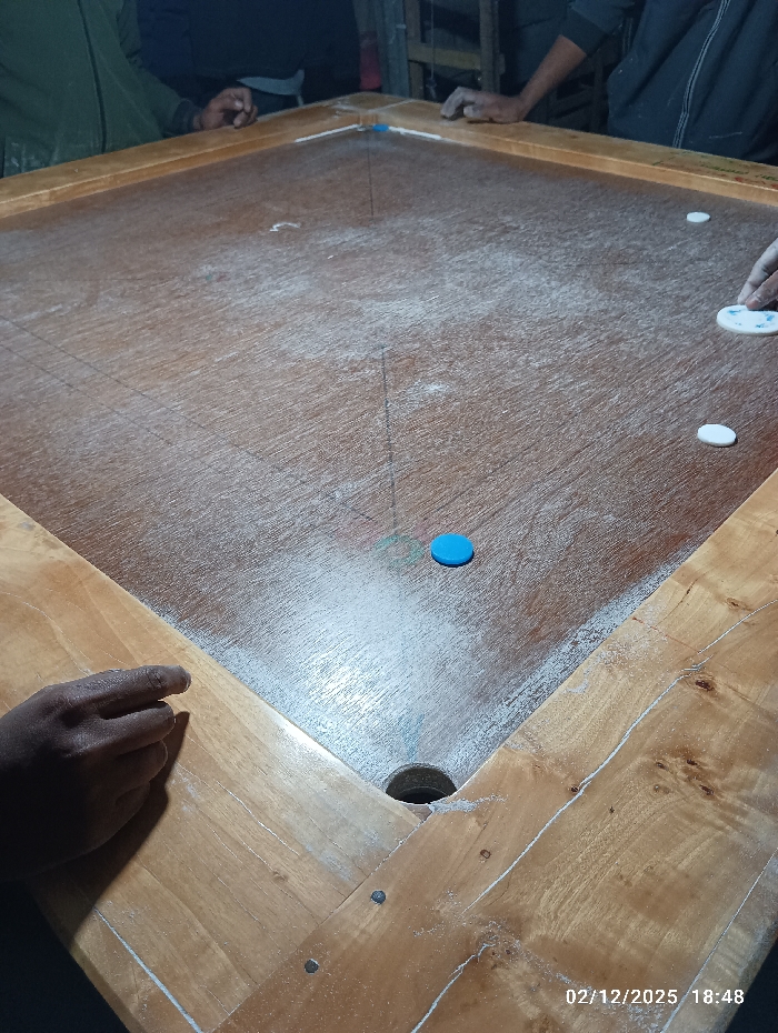 - "An overhead, angled view captures a wooden carrom board, dusted heavily with white powder, located in Maliat, Bangladesh" by FM-qwTJi2, licensed under CC BY 4.0