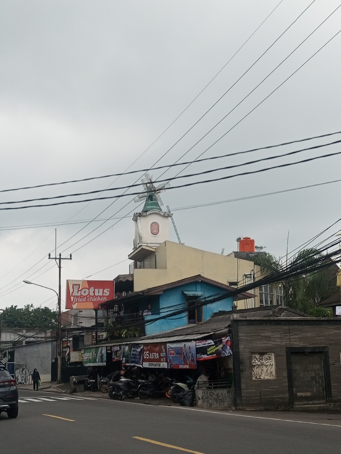 A street view features a "Lotus Fried Chicken" sign atop a building. Behind, a structure with a windmill-like tower emerges. Below, a blue-painted building and a darker, shaded storefront display advertisements, motorcycles parked nearby. Wires crisscross the cloudy sky, partially obscuring the view. A street and the front of a vehicle are visible on the left with one person is walking along the street.