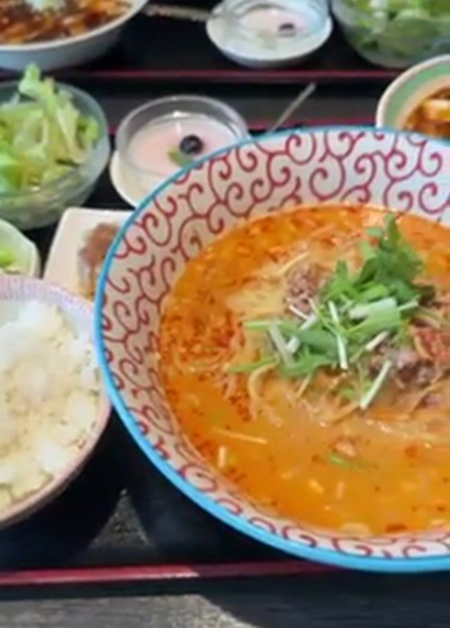 The video showcases a dining table set with a variety of dishes. The focal point is a bowl of orange-colored ramen topped with greens, placed next to a small bowl of white rice. Other items visible include a small plate with what appears to be dumplings, a bowl of green salad, a small dish of pink jelly, and a bowl of mapo tofu. There are two glasses of water in the background. The dishes are arranged on a black tray with a wooden frame. The camera pans slightly to provide a view of the various dishes.