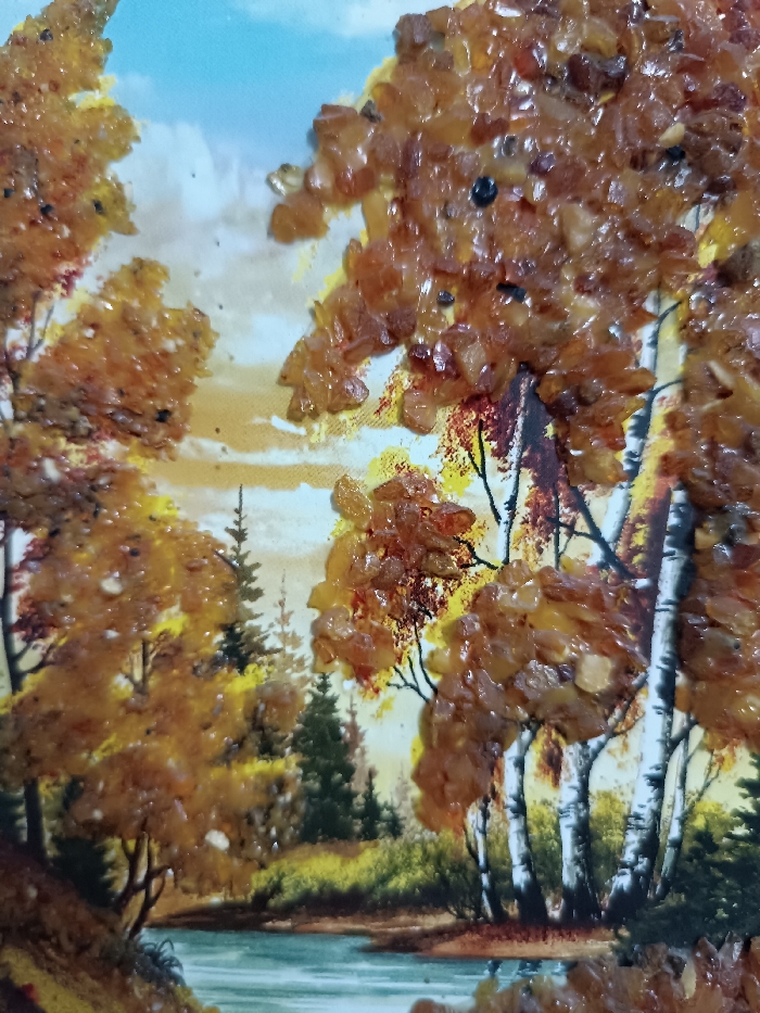 The image displays a mixed-media artwork depicting an autumn forest landscape with a river. The scene is rendered on a surface, likely canvas or board, featuring a painted background of a sky transitioning from light blue at the top to a golden-yellow horizon. Trees dominate the midground and foreground; their foliage is created from numerous small, irregularly shaped, translucent, amber-colored or resinous pieces, affixed to the surface, providing a textural, three-dimensional effect. On the right, several trees with distinct white trunks and dark markings, resembling birches, are prominent, their canopies formed by these amber pieces. On the left, another cluster of trees with similar amber foliage stands beside a body of turquoise and light blue water, representing a river or stream. Distant, dark green coniferous trees are visible among the background foliage. No people, specific actions, or interactions are depicted. The artwork itself is the subject, and the landscape it portrays is generic, not a specific identifiable location within the city of Tbilisi, Georgia.