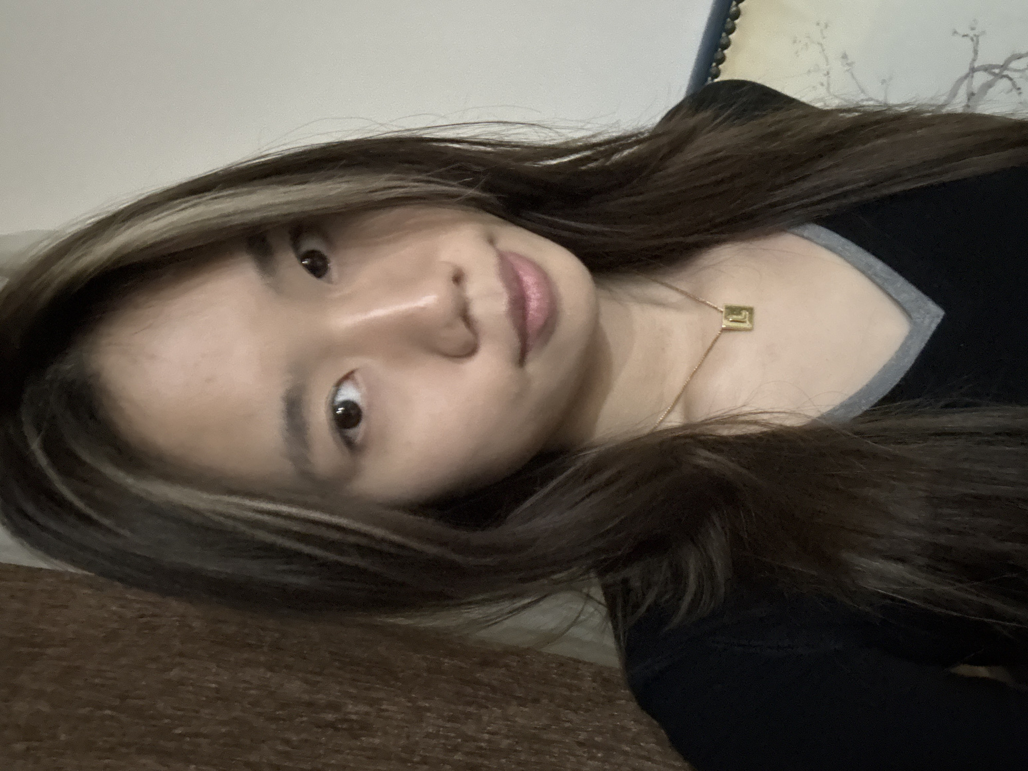A person is lying on a brown surface, likely a couch, with their head resting on the surface. The person has long brown hair with blonde highlights, a gold necklace with a square pendant, and is wearing a black shirt with a gray neckline. The background includes a white wall and what appears to be a framed picture. There is no verifiable evidence to pinpoint the location of this scene within Yuzhong District, China or any other specific location.