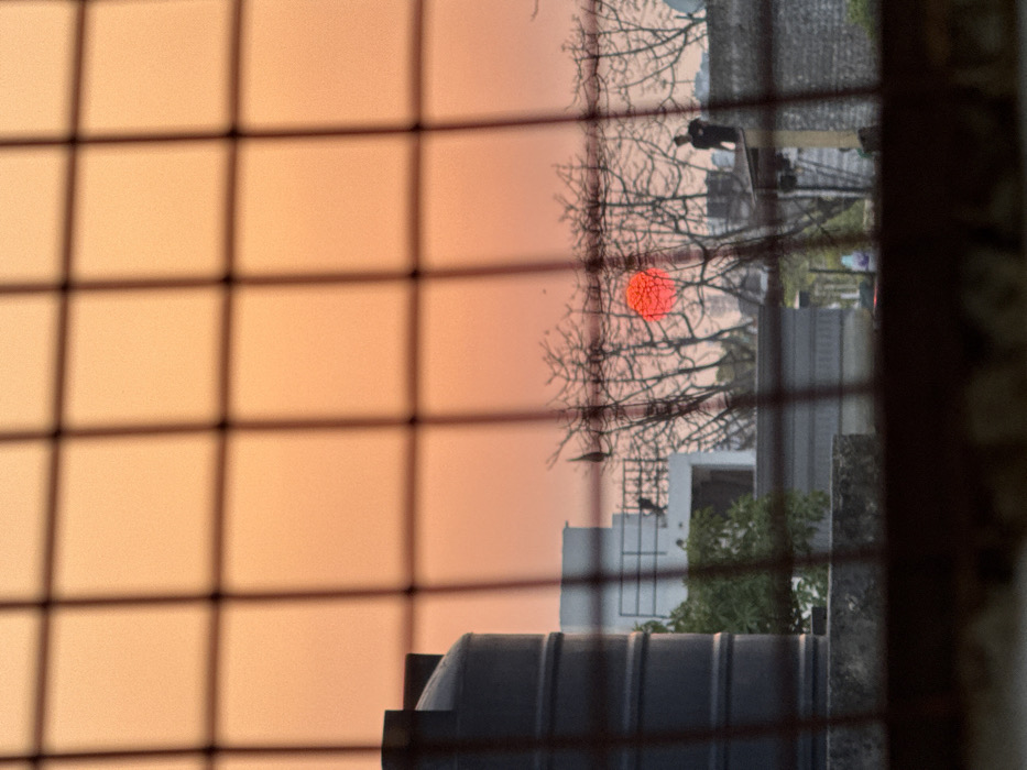 The image depicts an urban twilight scene in Delhi, India, viewed through a dark, out-of-focus square grid in the foreground. The sky displays a dominant orange-pink gradient. A distinct, bright red, circular sun disc is positioned towards the mid-right, partially obscured by numerous bare tree branches silhouetted against the sky. In the left midground, a large, dark grey cylindrical water storage tank rests on a concrete base, indicating a rooftop installation. Behind it, parts of a white-walled building with upper-level railings are visible. The extensive network of leafless tree branches dominates the central and right midground. A dark silhouette of a bird is perched on a branch to the left of the sun. On the far right, a single human figure stands upright on a distant rooftop or elevated structure, appearing as a dark silhouette. The environment is consistent with a residential or mixed-use urban area at either sunrise or sunset.