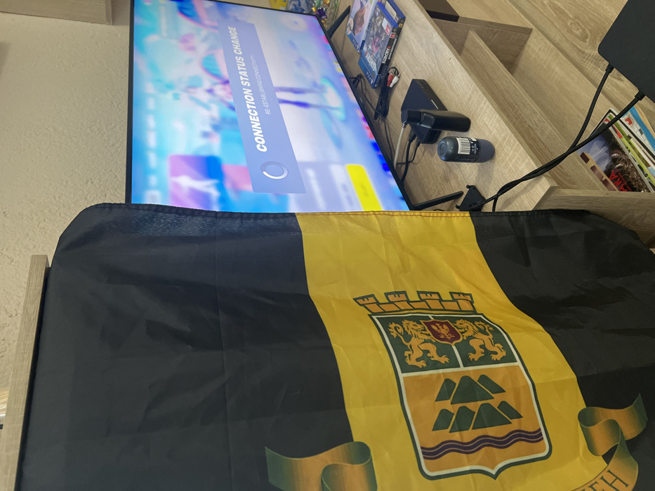 The image portrays an indoor setting in Sedlartsi, Bulgaria, focusing on a media entertainment area. In the foreground on the left, a black and yellow flag is partially visible, hanging vertically. The yellow section of the flag displays a detailed coat of arms featuring green escutcheons with geometric patterns, two rampant lions, and a mural crown motif. To the right, a flat-screen television is actively displaying a video game interface, specifically a "CONNECTION STATUS CHANGE" message indicating "RE-ESTABLISHING CONNECTIVITY" alongside a circular loading icon. The background of the television screen shows stylized human figures from the video game (likely Fortnite). Below the television, a light wood-grain media console with two shelves holds several items. On the top shelf, from left to right, are a black modem/router, a small black rectangular electronic device, a dark grey roll-on deodorant, a small black bottle, and a stack of PlayStation game cases, including "Far Cry 5" and "Far Cry New Dawn". Black cables are visible, connecting various electronic components on the console to the television. The lower shelf contains additional stacked items, possibly magazines or papers. The wall behind the console and television is light-colored and textured, and the floor is a light wood or laminate. No individuals are present in the scene.