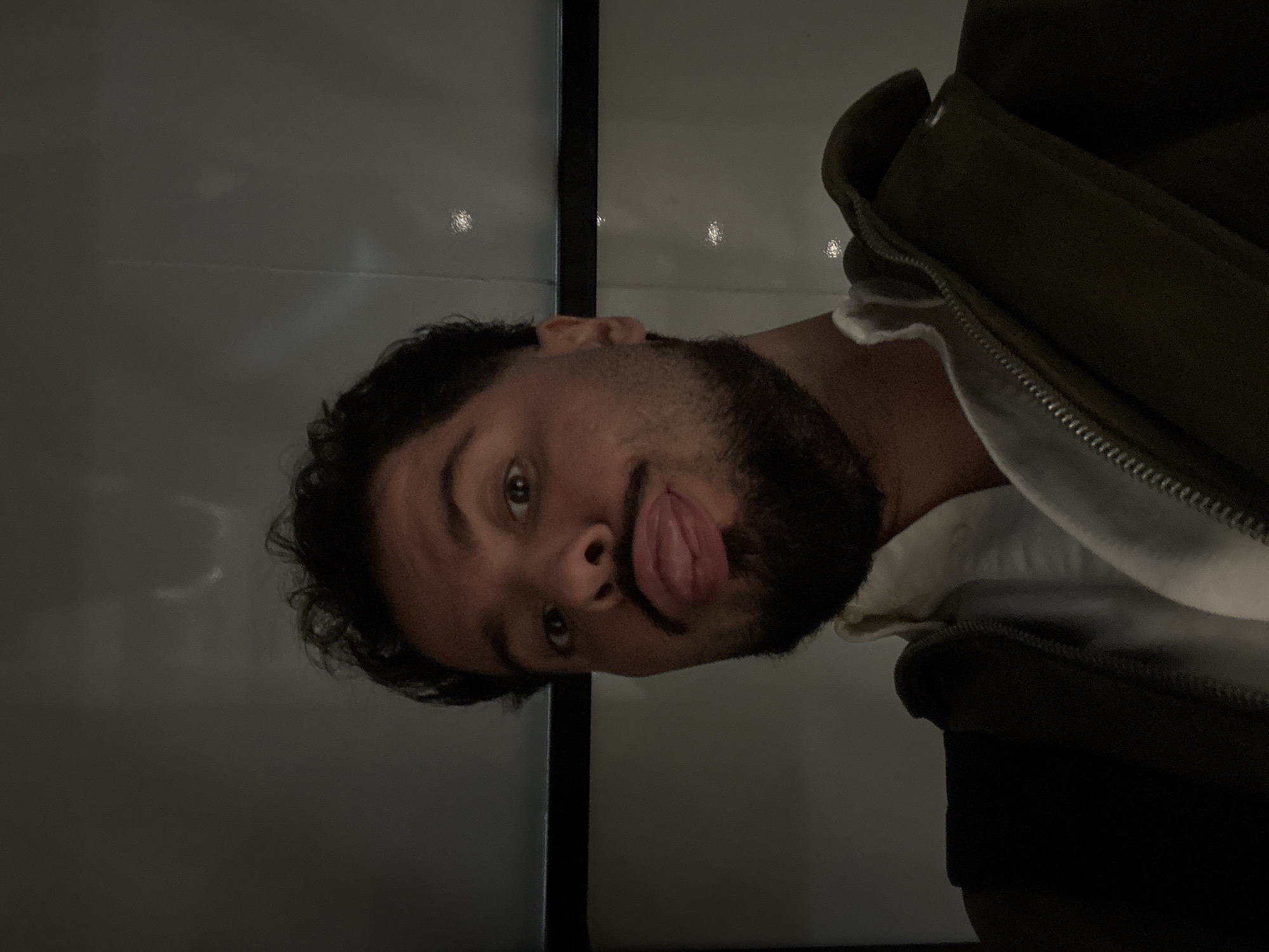 The image displays a close-up view of an adult male's head and upper torso. The specific location within Niederanven, Luxembourg, is not discernible from the visual evidence; the background appears to be a dimly lit, nondescript indoor environment, featuring a light-colored surface with a dark horizontal linear element and faint reflections or light points visible. The subject is a male with dark, curly hair, dark eyes, and a groomed beard and mustache. He is wearing a light-colored collared shirt under a dark-colored, zippered jacket. His head is slightly tilted, and his tongue is extended from his mouth. His eyes are open and directed towards the viewer/camera. The scene is illuminated by low light, contributing to areas of shadow on the subject and background.