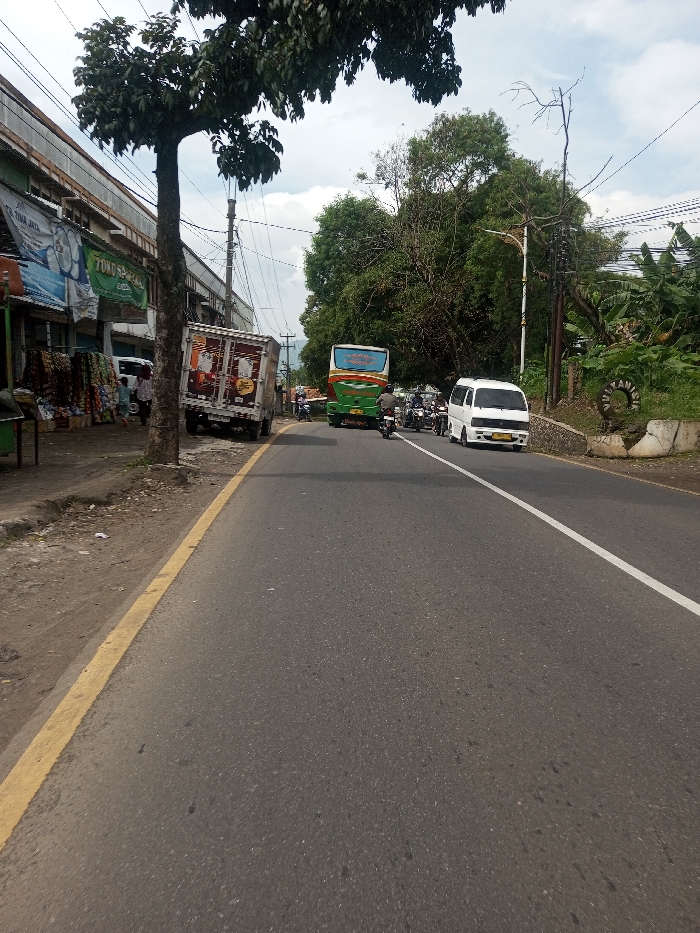 An outdoor street scene in Chhenangri_Rishor, Bhutan, is depicted under an overcast sky. An asphalt road with a solid yellow edge line on the left and a white line separating lanes extends into the background. On the left side, a dirt shoulder leads to a row of commercial buildings. These buildings feature awnings and display various merchandise, with visible signage including "ZIVA JAYA" and "TOKO SEPATU". A medium-sized tree with green foliage stands on the shoulder. A light-colored box truck, adorned with brown and white graphics, is parked on the left shoulder, partially obstructing a storefront. Several individuals are present on the sidewalk area near the shops and the truck. On the road, a green and blue bus is positioned further down, followed by multiple motorcycles with riders. A white passenger van is visible on the right side of the road in the mid-ground, facing away from the viewer. The right side of the road features dense green vegetation, including banana plants, and a concrete retaining wall with partial text "UDANAN". Utility poles with overhead wires are visible throughout the scene. Distant hills or mountains are faintly discernible in the background beneath the cloudy sky.