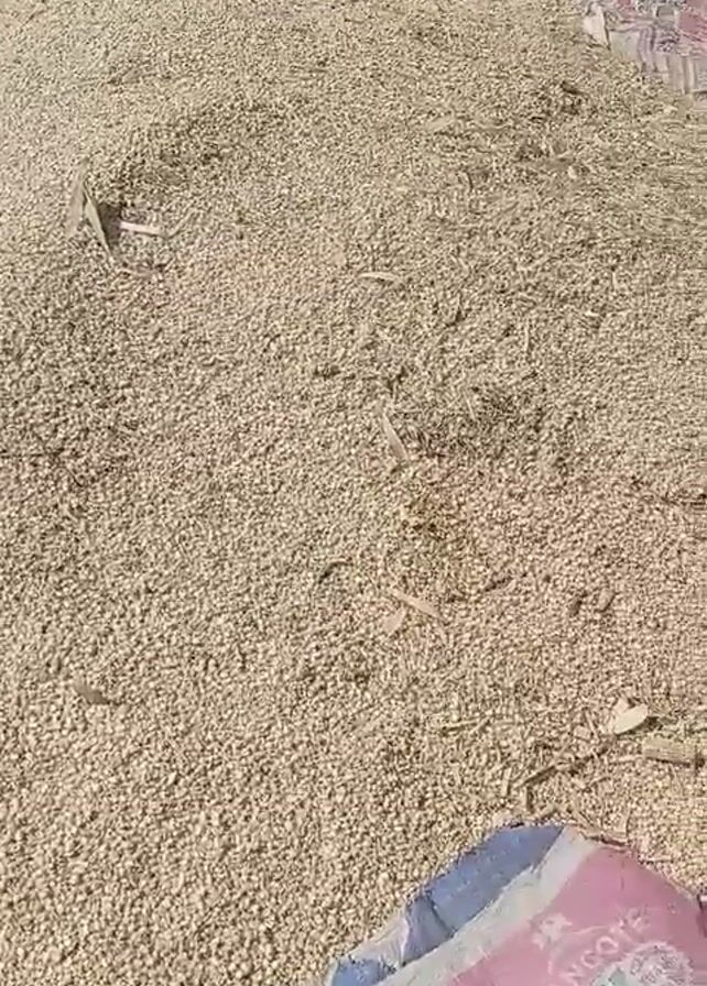 two women in a field processing grain. A black bucket sits in the foreground with some grain in it. In the background, a woman in a black dress is raising her arms over her head as if pounding something. The other woman, wearing a blue shirt and a purple patterned skirt, stands facing the camera. The ground is covered with a large amount of grain spread out on a tarp and the bare earth. In the background, there are some tall grasses.