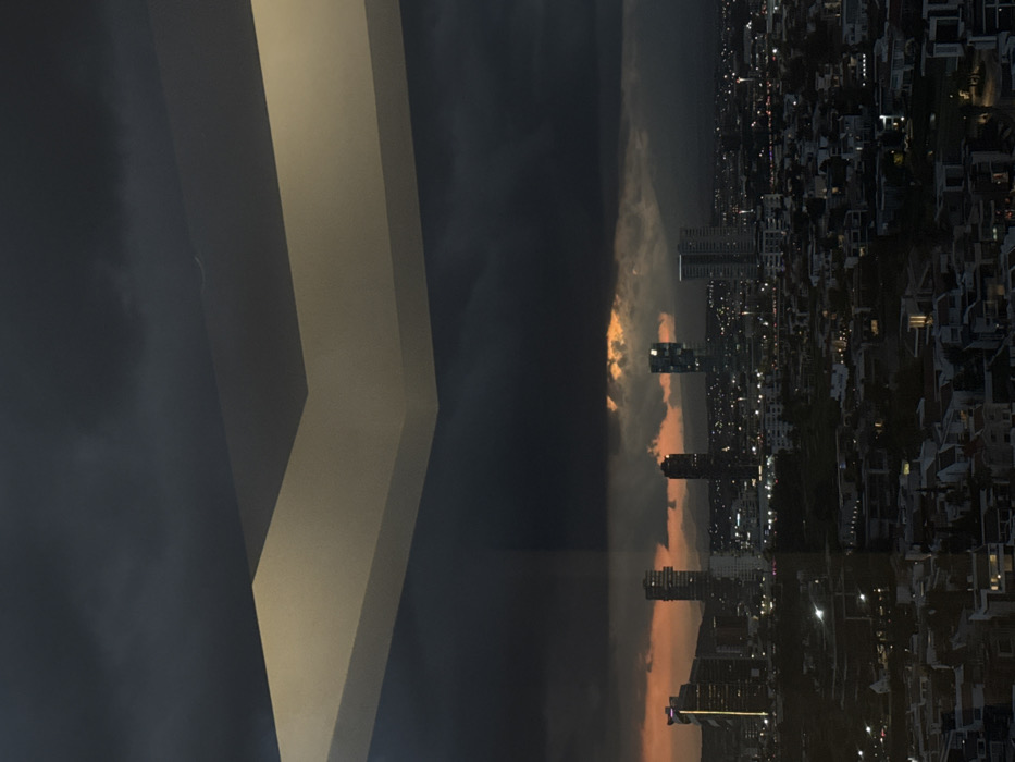 The image displays an elevated panoramic view of Puebla City, Mexico, at dusk or night, under a dramatic and heavily clouded sky. The upper section of the photograph contains a reflection of an interior beige-colored architectural corner element and a subtle vertical line, suggesting the image was captured through a window. Below the reflection, the sky is dominated by dark gray and black storm clouds. A horizontal band of orange and reddish light is visible beneath these dark clouds, particularly in the middle distance, indicating either a sunset or atmospheric light interacting with the urban glow. The cityscape extends across the middle and lower portions of the frame, featuring a dense urban environment illuminated by numerous artificial lights. Prominent in the skyline are several tall buildings and skyscrapers. From left to right, a slender, illuminated high-rise is visible, followed by two dark high-rises with internal illumination. A distinctive, irregularly shaped, modern glass skyscraper (identifiable as Torre Helea) stands out to the right of center. Further right, a pair of conjoined, lighter-colored tall buildings are present. The urban sprawl below these high-rises is densely packed with buildings, all dotted with streetlights and interior lights. Faint outlines of hills or mountains are discernible in the distant background beneath the clouds. No people, explicit actions, or interactions are depicted in the scene.