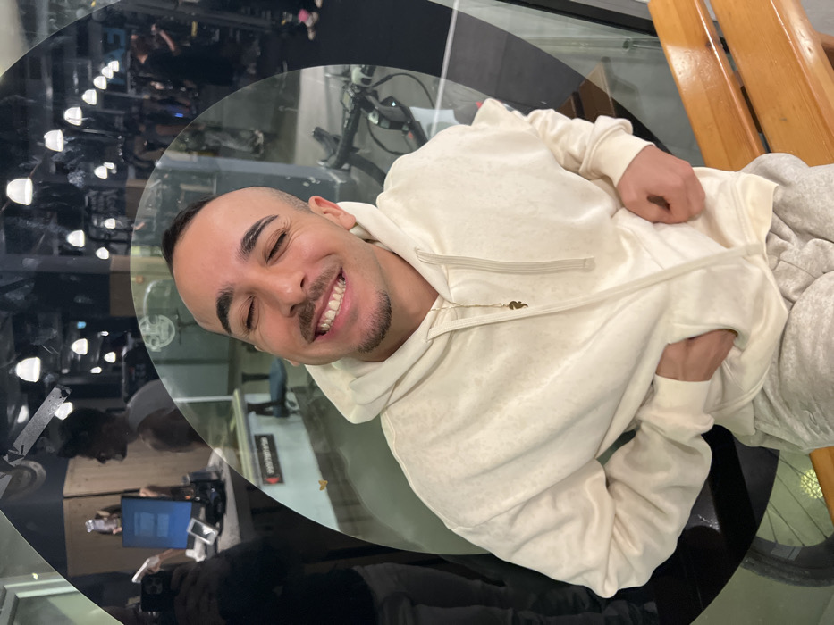 A man smiles while sitting at a black, reflective table, capturing his reflection along with parts of a gym and a person working on a laptop. He wears a light-colored hooded sweatshirt and gray sweatpants. Wooden slats are visible near him. The reflection on the table shows exercise bikes and other gym equipment in the background.