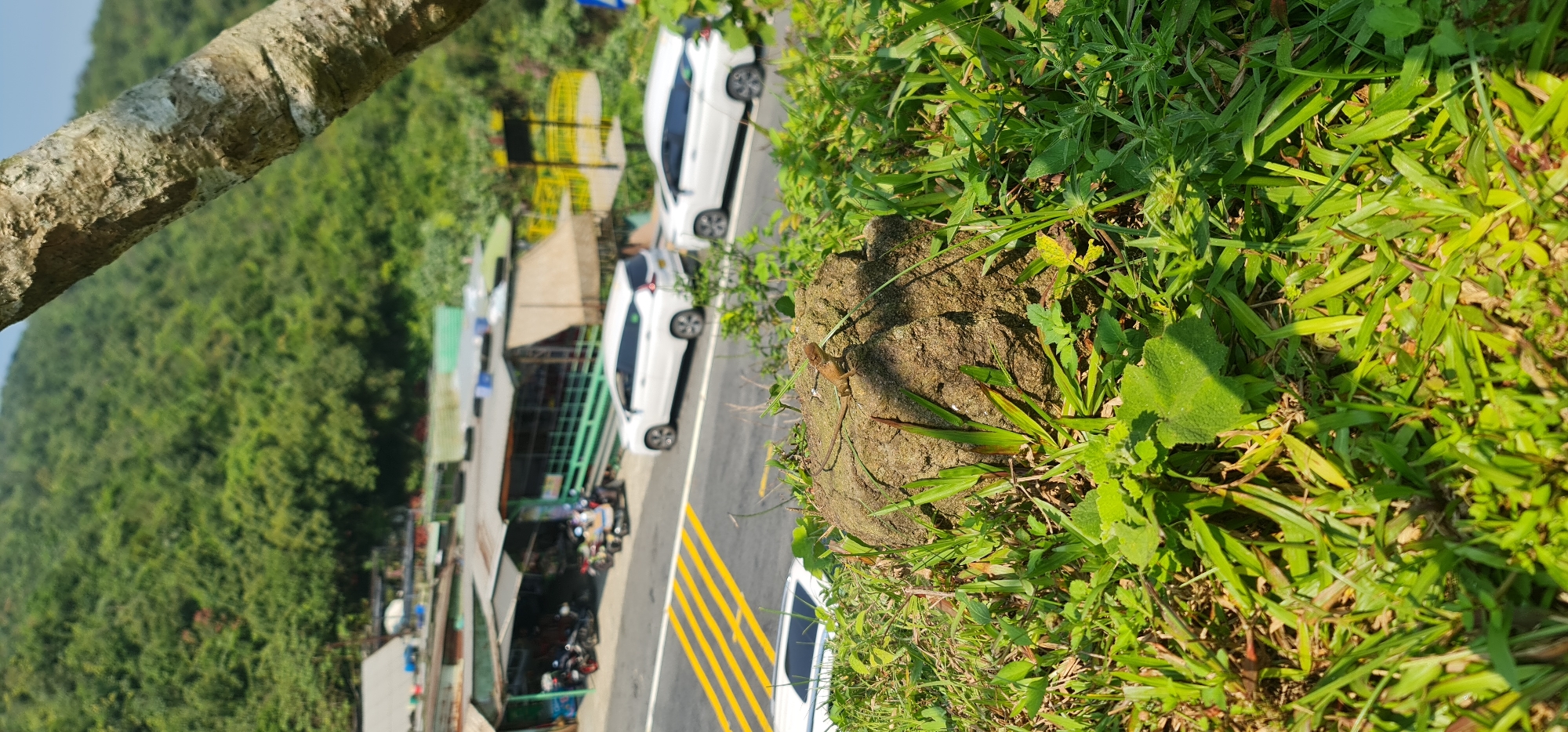 roadside scene in Huế, Vietnam. **Environment:** Lush green vegetation surrounds a dirt mound on the right side of the image. The background features a densely forested hill. **Objects:** A weathered tree branch is visible in the upper-left corner. A road runs parallel to the foreground, marked with yellow lines. Parked white cars and commercial structures are visible on the opposite side of the road. There is a lizard on the dirt mound. **Actions:** None are visible. **Interactions:** None are visible.