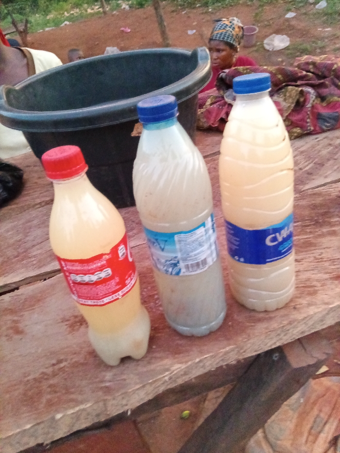 On a weathered wooden surface, three plastic bottles are filled with cloudy, yellowish liquids. The leftmost bottle has a red cap and label, while the other two bear blue caps and labels, one partially obscured. A black bucket sits to the left, partially filled. In the background, a woman with a headscarf sits amidst colorful patterned fabric. Other people are present in the background, along with glimpses of foliage.
