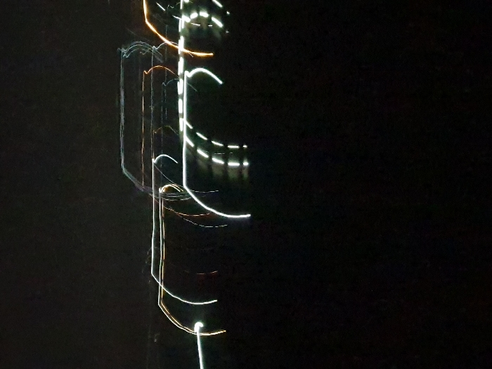 Long exposure photography captures a series of white and yellow light streaks against a black background. The lights form curved and angular patterns, resembling a blurred, deconstructed structure. Intermittent dashes of white light are dispersed vertically, providing contrast against the continuous lines. The composition is dark and abstract, emphasizing the play of light and movement.
