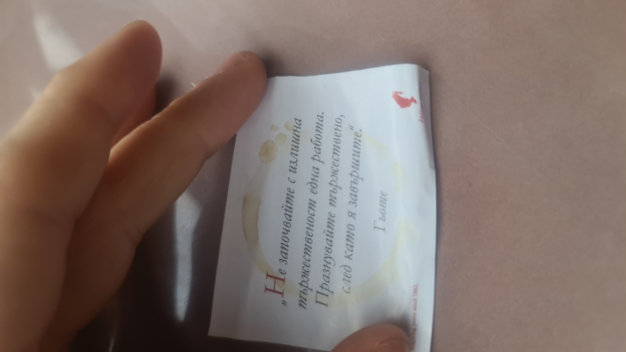 The image depicts a hand holding a small, crumpled piece of white paper with Bulgarian text printed on it. The text includes a quote attributed to Goethe. The paper has coffee stains on it. The background is a smooth, light brown surface. There is no clear evidence of a location within Sofia, Bulgaria.