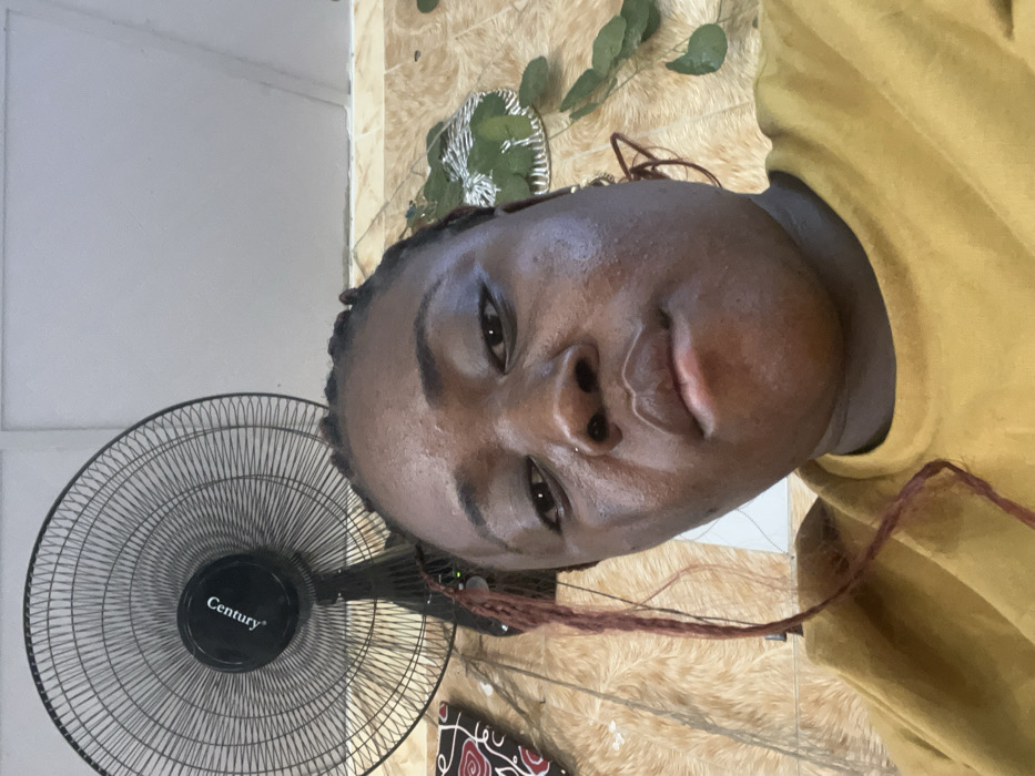 An individual is depicted in an indoor selfie, centered in the frame, looking directly at the camera. The subject is an adult female with dark skin, dark braided hair, and a small silver nose piercing on her right nostril. She is wearing a mustard yellow long-sleeved top. A pair of reddish-brown framed glasses are visible behind her right ear. In the upper left background, a black Century brand standing fan is partially visible. The wall behind the subject is covered with light brown or beige textured tiles. A decorative item with red, black, and white swirl patterns is partially visible on the left side of the wall, and a green, leaf-like wall decoration is visible on the right side. The ceiling is white or light grey. The setting is an unidentified indoor space within the city of Abuja, Federal Capital Territory, Nigeria, consistent with a residential or commercial interior. No specific street address or landmark is discernible.