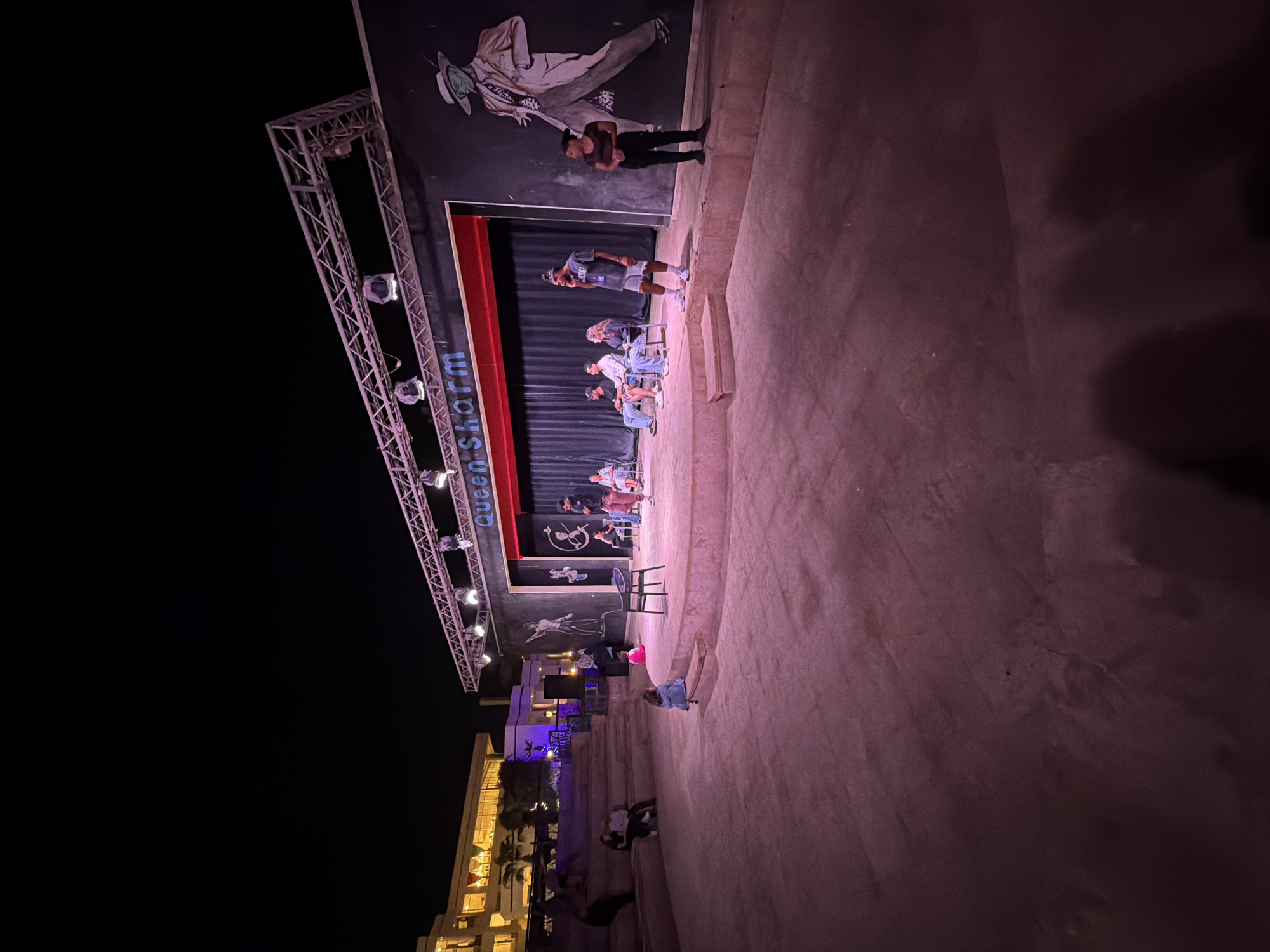 The image depicts an outdoor stage in Sharm El Sheikh, Egypt, likely at night. The stage features a mural of a figure in a suit and fedora, possibly Michael Jackson. There are at least six people visible on the stage, including a man standing behind seated individuals, possibly performers or audience members. A lighting rig is positioned to the left of the stage. In the foreground, more people are seated on steps, suggesting an audience area. A building with illuminated windows is visible in the background. The ground area is a light-colored surface, possibly concrete or pavement. The overall atmosphere is dimly lit with an emphasis on the stage area.