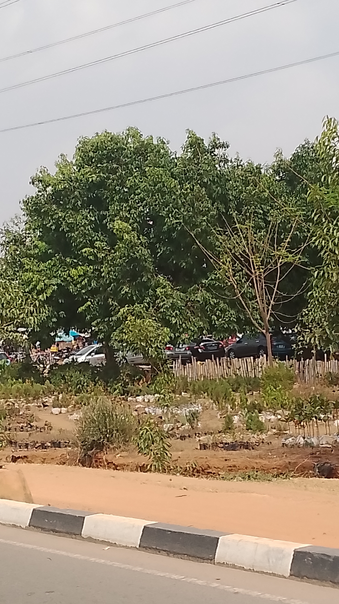 The image depicts a daytime scene in Kuchingoro, Nigeria, under an overcast or hazy light gray sky with three parallel power lines visible in the upper frame. In the immediate foreground, a segment of a paved road with a solid white line is visible. This road is bordered by a concrete curb painted in alternating black and white rectangular blocks. Beyond the curb, a wide strip of reddish-brown unpaved earth contains a plant nursery, evidenced by numerous small plants growing in black plastic bags arranged on the ground. A low fence, constructed from vertical wooden or bamboo stakes, delineates the far edge of this nursery. The background is dominated by a dense canopy of green trees, largely obscuring the area behind the fence. Through the foliage, multiple vehicles, including several dark-colored sedans and at least one light-colored vehicle, are visible, suggesting a parking area or a busy thoroughfare. Indistinct colorful structures partially visible behind the vehicles hint at a market or commercial activity. No specific individuals or their actions are clearly discernible.