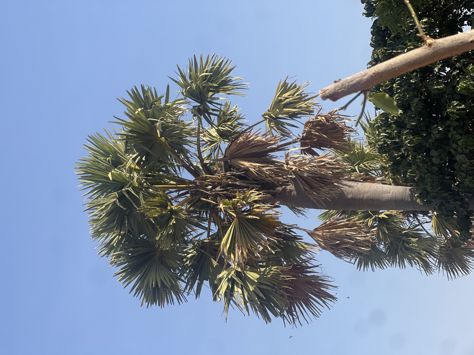 A low-angle shot features a palm tree against a clear, light blue sky