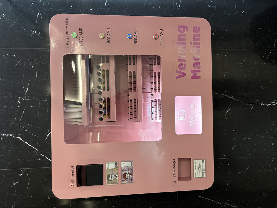 A light pink vending machine stands upright against a dark, polished background with white veining, consistent with marble or granite, in Tsovagyugh, Armenia