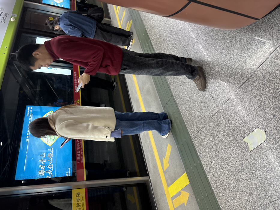 People are standing at a train station. A man is wearing a red sweatshirt, and the woman in front of him wears a tan jacket. The woman has long brown hair. The man looks at his phone. Behind them, a person in a denim jacket stands. There is a sign on the train that reads, "Green water and green mountains are Jinshan Yinshan." The train station floor is gray tile. Yellow arrows point toward the train.