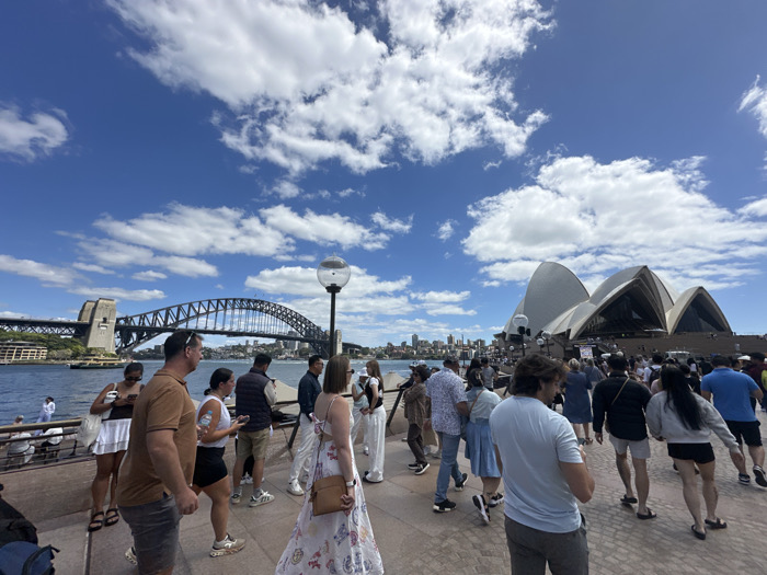 The Sydney Opera House and Harbour Bridge dominate a scene filled with tourists