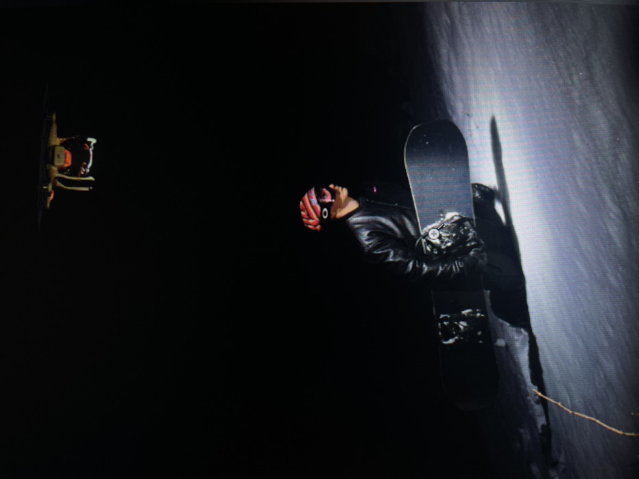 A snowboarder in a leather jacket and patterned helmet is propped against a snowy, light-colored wall. The snowboard is mostly black and also rests against the wall. To the left and significantly further away is a piece of ski equipment, possibly a ski binding, colored tan, black, and red. The background is very dark, obscuring details of the surroundings.