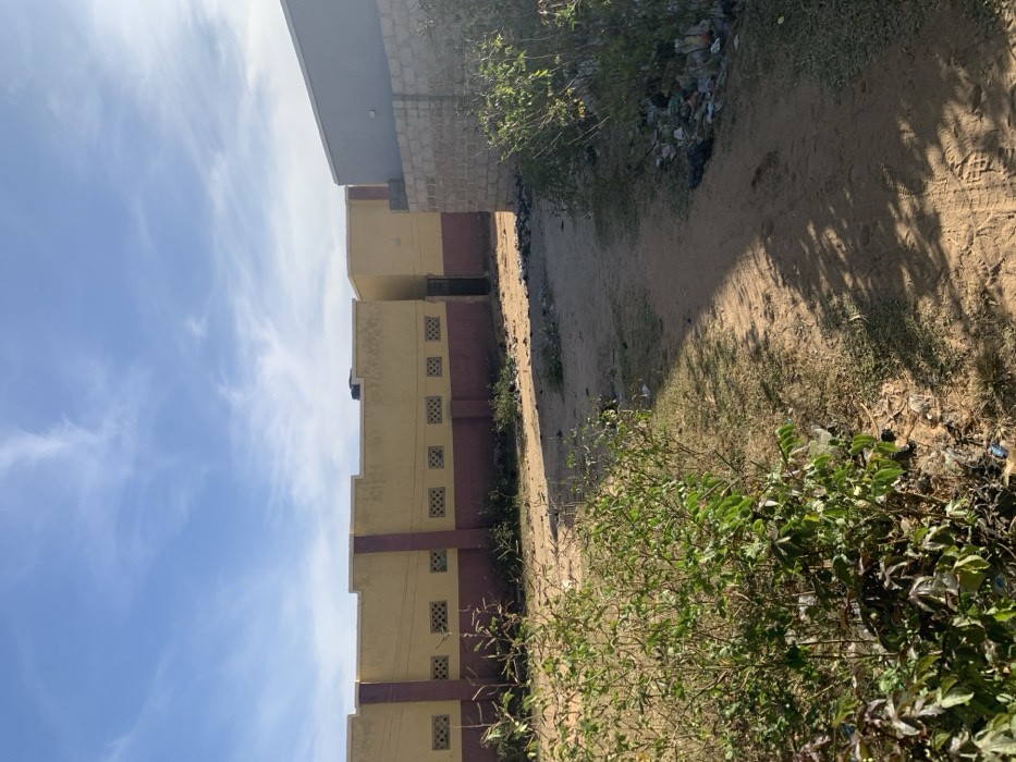 This image depicts an outdoor environment in Dabawa, Nigeria, under a bright blue sky with wispy white clouds. The foreground consists of dry, sandy soil with scattered patches of light green and desiccated vegetation. A narrow dirt path, approximately one meter wide, runs from the foreground towards the midground, marked by visible indentations. Dense green shrubbery occupies the left foreground, while sparser, shorter plants are visible on the right, interspersed with accumulated debris and plastic waste. In the midground, a substantial building with a light yellow upper section and a maroon-red lower section is visible. Its roofline features a stepped, crenellated design, and numerous square ventilation openings are uniformly spaced along the lower wall. A dark, recessed opening, possibly an entrance, is present between two sections of this structure. A black water storage tank is visible on the roof of the leftmost section. To the right, a second building, partially constructed or undergoing renovation, shows exposed cinder block on its lower portion and a smooth, light grey upper wall. No individuals are present, and no active interactions are depicted.