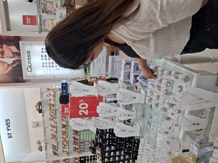 A woman is shopping in a store. She is looking at a display of jewelry on a glass table. There are necklaces, earrings, and bracelets on display. The woman is wearing a white cardigan and black denim shorts. In the background, there are shelves of shoes and sunglasses. There are also signs that say "20% off". The store is well-lit and appears to be clean and organized.