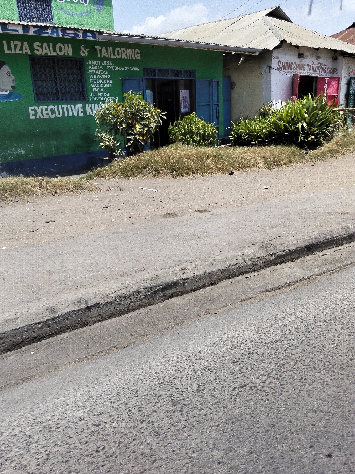 The scene depicts a street in Mkomani ward, Kenya, under a bright, sunny sky. The foreground features an asphalt road, textured and worn, with a distinct raised curb line separating it from an unpaved shoulder of dry, sparse grass and weeds. Beyond the shoulder are two adjacent single-story commercial buildings. The building on the left is painted vibrant green and bears the sign "LIZA SALON & TAILORING." Services such as "KNOT LESS," "ABUJA," "EYEBROW SHAVING," "BRAIDS," "WEAVING," "PEDICURE," "MANICURE," "FACIAL," "GEL POLISH," and "DREADLOCKS" are listed vertically on the wall, beneath which reads "EXECUTIVE KIDS." A painted profile of a dark-skinned head is visible on the far left. The building has a barred window and an open double-leaf door with blue frames. Several green bushes grow directly in front of this building. To the right, an adjoining building is painted a light beige or off-white color and features a red sign that reads "SHINE SHINE TAILORING SHOP." It has a partially open doorway with red framing. Both buildings are topped with corrugated metal roofs. No individuals or dynamic actions are visible in the image.