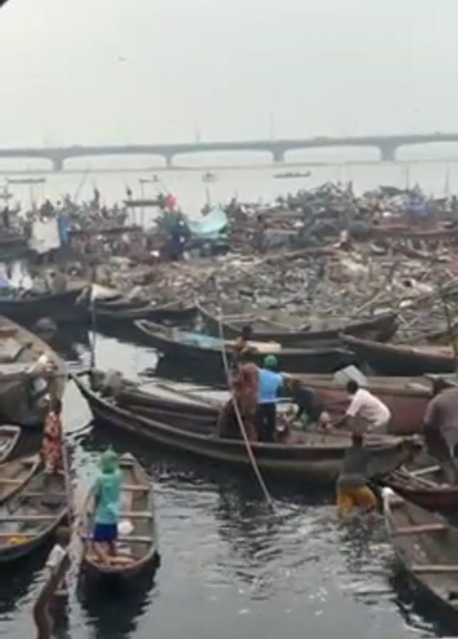 densely populated area with numerous wooden boats in a body of water. Many people are working and moving around on the boats. In the background, there appears to be a large amount of debris and makeshift structures, suggesting a shanty town or informal settlement. A bridge is visible in the distance under a gray sky. The water seems dark and possibly polluted.