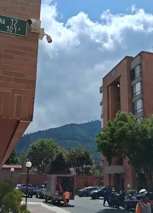n urban scene with a mix of residential buildings, trees, and street activity. The buildings are primarily made of red brick. A street sign indicates "Carrera 12, Calle 107A." There's a security camera mounted on the corner of one building. In the distance, a mountain can be seen under a sky with scattered clouds. Several people are working on or around a truck, wearing orange safety vests. A yellow taxi, with license plate "WMM 459", drives past. The taxi has "SERVICIO PUBLICO" written on its side. A person in a similar orange safety vest walks along the sidewalk. There are other parked cars and motorcycles along the street. The overall environment is a mix of urban and natural elements.