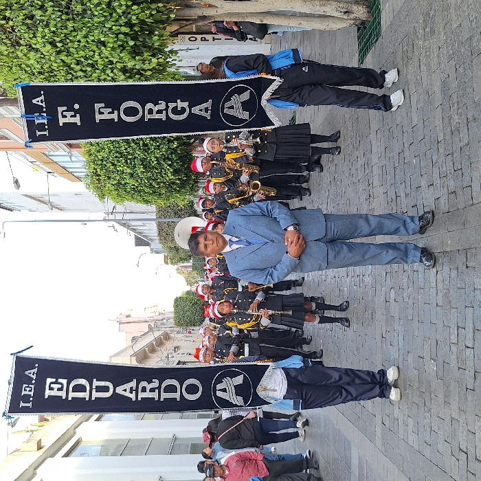 A parade marches down a brick street. In the lead is a man in a light blue suit. Behind him is a marching band, dressed in dark uniforms with red Santa hats. The band plays instruments such as saxophones, flutes, and a sousaphone. Banners with the text "I.E.A. EDUARDO" and "I.E.A. F FORCA" flank the group. The buildings are visible in the background.