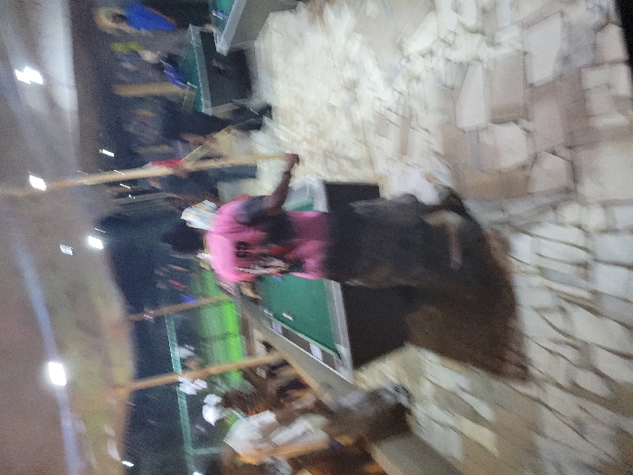 An indoor gathering features a woman in a pink top standing near a green-topped table or counter. A crowd of people is visible in the background, some sitting. Above, there are visible lights. A textured wall with a stone-like design is present. The image's orientation appears tilted.