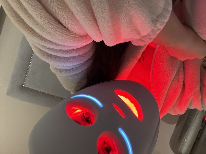 The image displays a close-up, slightly overhead view of an individual undergoing a facial treatment in an indoor setting. The central subject is a person wearing a white, opaque facial mask designed for light therapy. The mask features two large circular eye apertures and two smaller, curvilinear mouth-like apertures, all emitting red light. The individual's eyes are visible through the mask's eye openings. Two curved lines of blue light are present on the upper portion of the mask. The individual is dressed in a light-colored, possibly cream or white, plush or terrycloth bathrobe, which is visible on the shoulders and arms. Red light emanating from the mask illuminates parts of the person's skin and the bathrobe. Dark hair is visible below the mask. In the upper right quadrant of the background, a gray or light blue upholstered object with decorative nailhead trim is partially visible, consistent with a headboard or a piece of furniture. The specific location within Naucalpan de Juárez, Mexico, cannot be determined from the visual evidence presented in the image.