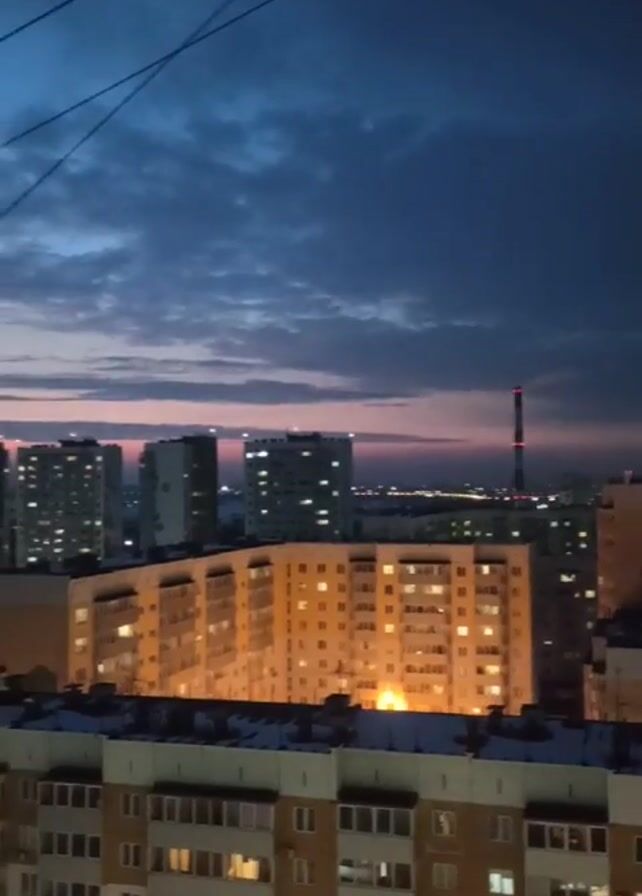 The video presents an elevated view of a cityscape at dusk. Several multi-story buildings are visible, with many windows illuminated, indicating activity within. The sky features a gradient of colors, ranging from a deep blue above to a pinkish hue on the horizon. Cables are visible in the foreground, stretching across the upper part of the frame. The area below the buildings is covered in snow.