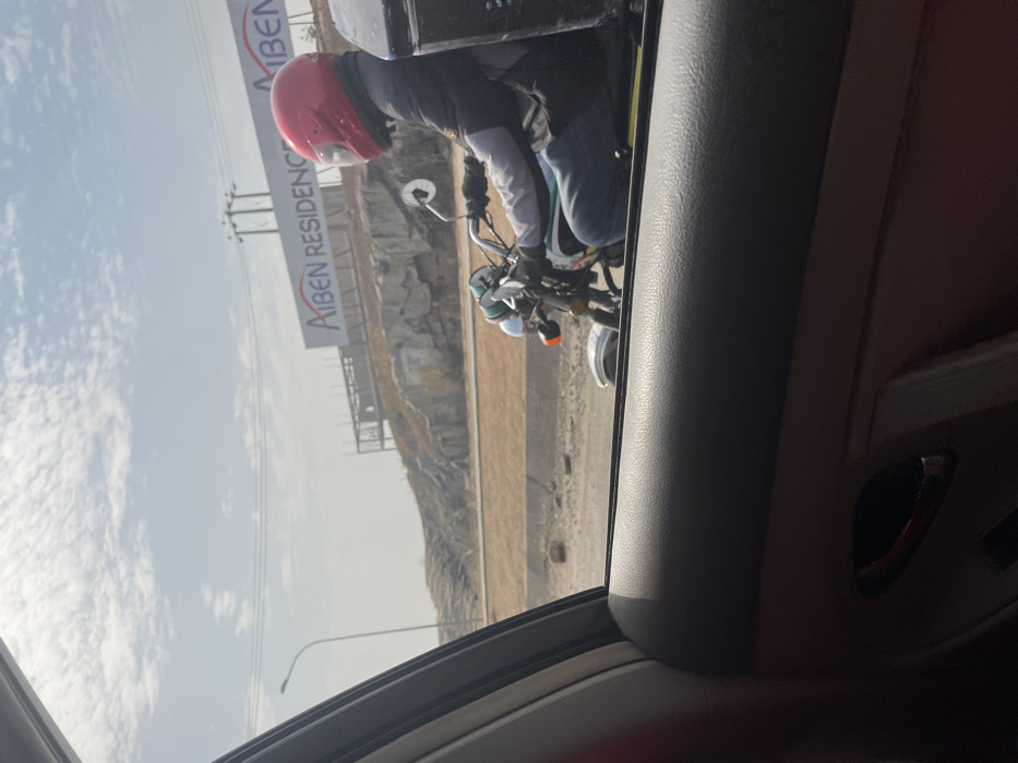 The image captures an outdoor daytime scene in Kagini, Abuja, Nigeria, observed from inside a vehicle, looking out the right-side window. The foreground shows a partial view of the vehicle's beige and dark gray door panel with a visible door handle. In the midground, a person wearing a red full-face helmet, a dark jacket with light gray sleeves, blue jeans, and dark gloves is seated on a motorcycle. The motorcycle features a light-colored front fender, chrome handlebars, a right-side mirror, and details including green and light blue accents on its bodywork. The rider is oriented to the right, consistent with forward travel or a stop on a roadway. The background displays a paved road surface with a wide, dry, unpaved shoulder. Beyond this shoulder lies elevated, rocky terrain with sparse dry vegetation. A large white billboard is prominently situated on this higher ground, displaying "AIBEN RESIDENCE" in bold white lettering, featuring a red stylized "A". To the left and behind the billboard, an incomplete building structure with visible framework or scaffolding is present. Overhead utility lines are visible, supported by poles. A street light pole stands in the far left of the frame. The sky is bright with scattered clouds.