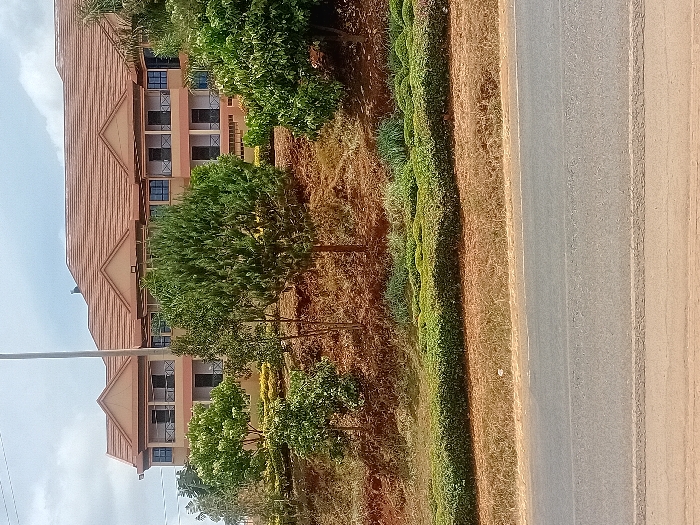 A large, multi-story building with a light tan facade and multiple gabled, reddish-brown tiled roofs is situated on an elevated, terraced landscape in Karingani ward, Kenya. The building features numerous dark-framed windows and balconies with dark metal railings across at least two visible levels. In the midground, an unpaved road with a faded white centerline runs horizontally. Above the road, a landscaped embankment displays rows of neatly trimmed green bushes, dry brown grass, and various trees of differing heights, including a prominent conifer-type tree. The terrain behind the bushes and trees consists of reddish-brown soil. A tall, dark utility pole stands vertically in the left-center, extending into a partly cloudy sky. No individuals, vehicles, or specific activities are observable in the static scene.
